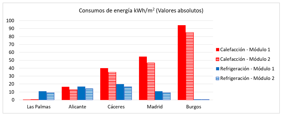 Para evidenciar el potencial de la inercia térmica, particularmente del hormigón, en la eficiencia energética de los edificios, el Instituto Español del Cemento y sus Aplicaciones estudió el caso de un edificio de viviendas colectivas con un diseño estrictamente pasivo. Se evaluó su comportamiento con dos tipos de cerramiento, por un lado, uno liviano convencional (módulo 1) y otro de hormigón (módulo 2). En la Figura 14 se grafican los consumos de energía para estos módulos de vivienda idénticos, con distintas ubicaciones en España, para calefacción y refrigeración. El módulo 2 presenta menores valores gracias a la inercia térmica del hormigón, consiguiendo ahorros aproximadamente de 12% para calefacción y de 20% para refrigeración (Intituto del Cemento Portland Argentino-Instituto Español del Cemento y sus Aplicaciones, 2020)