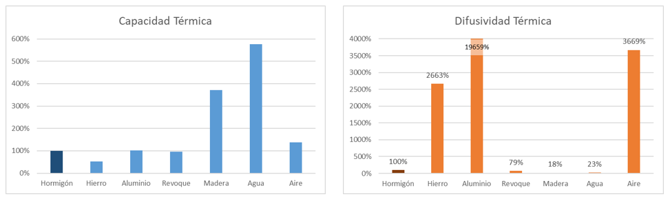 [4]La profundidad dentro del material a la que pueden llegar los cambios diarios de temperatura, por ejemplo, un muro de hormigón, depende de la difusividad térmica. Materiales con una mayor difusividad térmica pueden ser más efectivos para almacenamiento cíclico de calor a mayor profundidad (CIBSE, 2013). Materiales con alto calor específico y densidad y, por lo tanto, baja difusividad térmica, tienen el potencial de una alta masa térmica. En las Figuras 16 a y b se muestran la capacidad y difusividad térmica de diferentes materiales de manera comparativa con el hormigón. La capacidad térmica o calorífica [J/°C] se define como el producto del calor específico de un material por su masa.