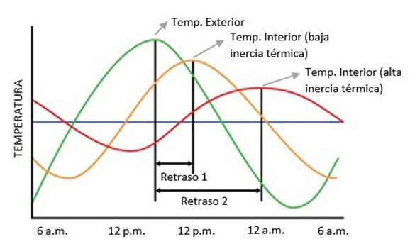Los elementos con inercia térmica absorben y ceden el calor lentamente, lo que genera un retardo (o desfase) del ingreso de la temperatura exterior al interior y viceversa, y también una atenuación (o amortiguamiento) de las amplitudes de las temperaturas extremas. Este efecto permite que los edificios permanezcan más tiempo en la zona de confort sin necesidad de gastos energéticos adicionales, lo que posibilita ahorros de manera gratuita porque son inherentes al material. De ese modo se puede contribuir a la reducción del uso de combustibles fósiles y emisiones contaminantes. (Figura 4). (Instituto Español del Cemento y sus Aplicaciones, 2019)