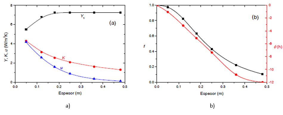 Existe cierta similitud entre la admitancia, la transmitancia dinámica, y la transmitancia térmica de un cerramiento porque las unidades para las tres es la misma, [W/m2/ºC], pero la transmitancia térmica se refiere al estado estacionario y no depende de la densidad o del calor específico del material. En tanto que la admitancia como la transmitancia dinámica son números complejos y pueden expresarse mediante una amplitud y una fase y dependen de las características del material del muro. La amortiguación y el tiempo de retraso entre la ocurrencia de las temperaturas máximas a cada lado de la pared, son función de la transmitancia dinámica. A modo de ejemplo, en las Figuras 18 a y b se representan gráficamente los valores de estos parámetros en función del espesor de un muro de mampostería.