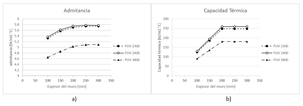 A partir de la herramienta de cálculo Dynamic Thermal Properties Calculator (The Concrete Center, 2010), se hicieron simulaciones de los parámetros térmicos de un muro de hormigón (admitancia, capacidad térmica, retardo y amortiguamiento) variando su espesor, considerando dos densidades de hormigón de peso normal (2300 y 2400 kg/m3) y un hormigón liviano de 1800 kg/m3. Los resultados de estas simulaciones se presentan en las Figuras 20 a y b.
