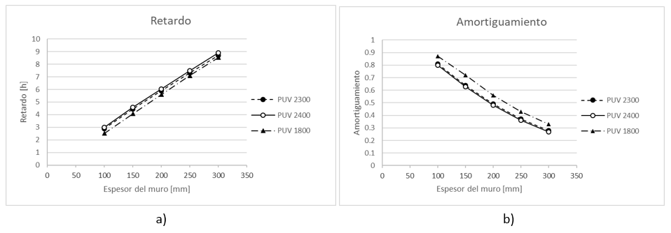 Del análisis de la Figura 21 a) se obtiene para un muro de 200 mm, un retardo de 6 horas en los picos de temperatura exterior; pero si el muro es de 100 mm, ese retardo es la mitad, es decir sólo 3 horas, valor que aunque es menor, no es despreciable comparado con su poco espesor. También se observa una muy buena correlación lineal entre el retardo obtenido y el espesor del muro, y que los valores de retardo obtenidos para cada espesor de muro son prácticamente iguales, independientemente de la densidad del material evaluado. En resumen, el retardo depende del espesor que tenga el muro a evaluar, dentro de los rangos y densidades estudiados.