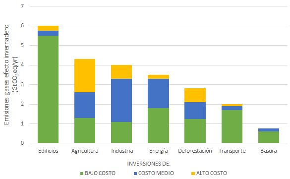 La construcción es en sí misma una de las industrias más contaminante y que más recursos naturales utiliza a nivel mundial. La producción de los materiales y el proceso constructivo como tal, implican importantes emisiones de gases de efecto invernadero, que se ven aún más incrementados durante la vida útil de los edificios. Los mayores requerimientos de energía en el sector residencial son para calefacción y refrigeración, es decir aquello relacionado al confort térmico. Particularmente en Argentina, más de la mitad del gas distribuido por redes tiene el fin de calefaccionar (Subsecretaría de Planeamiento Energético, 2019). El confort térmico es una condición en la que se expresa la satisfacción de las personas con el ambiente; influye en su desempeño cotidiano y en el trabajo, interactuando directamente con aspectos socio psicológicos, fisiológicos y físicos. Un hogar frío incrementa los riesgos de enfermedades cardiovasculares y respiratorias, así como deterioros en la salud mental (Saint Gobain, s.f.). La construcción eficiente considera las numerosas características de una vivienda que tienen una incidencia directa en los requerimientos energéticos, buscando la reducción de los consumos sin sacrificar prestaciones, especialmente el confort térmico. Adoptar estas prácticas tiene la potencialidad de minimizar rotundamente las emisiones de gases de efecto invernadero sin mayores inversiones en comparación con otras industrias (Figura 3). (Mackres, 2016).