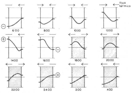 La evolución de la temperatura sobre la cara exterior presenta un valor mínimo en horas tempranas del día y un valor máximo durante la tarde, en función de la ubicación y orientación del cerramiento. En la Figura 5 se observa como varía la temperatura sobre la cara exterior de un muro con inercia térmica a lo largo de un día, mientras que la temperatura en la cara interior es casi constante y cercana a la temperatura de confort; aun cuando en el exterior las temperaturas descienden considerablemente.