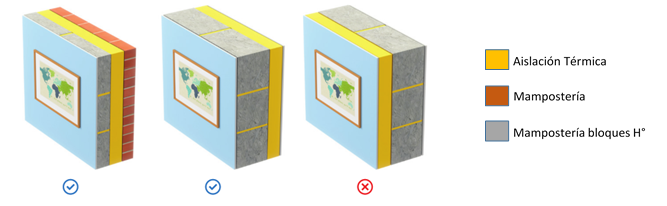 En las construcciones actuales se utilizan cerramientos de poco espesor y poca densidad (poca inercia), en ellas es factible alcanzar rápidamente la temperatura deseada en los interiores, pero para mantenerla es necesario utilizar importantes aislaciones y el funcionamiento continuo de equipos de climatización; lo que incrementa los consumos de energía, en relación a las construcciones con inercia térmica (Mac Donell y Mac Donell, 1999). Los beneficios que aporta la inercia térmica se pueden maximizar si se colocan materiales aislantes por el lado exterior (Figuras 6 y 7), y si se evitan los puentes térmicos; de esta manera se pueden disminuir las pérdidas (en los periodos fríos) y las ganancias de calor (en los periodos cálidos).