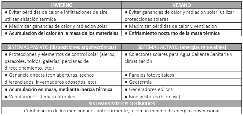 Para aprovechar las características de la inercia térmica en las construcciones es primordial lograr un buen diseño arquitectónico. La arquitectura bioclimática es una disciplina que busca obtener ambientes interiores confortables para sus ocupantes con un mínimo uso de energías convencionales y mediante disposiciones puramente arquitectónicas. Las estrategias bioclimáticas que se aplican en las construcciones se pueden clasificar según sea la época del año y el tipo de sistema utilizado para el acondicionamiento térmico (Tabla 1).