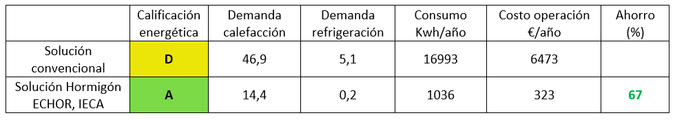 En búsqueda de la optimización en el uso de la masa térmica, a partir del caso anterior, se realizó un prototipo de vivienda de tamaño real denominado “ECHOR”, con predominancia del hormigón como material constitutivo. En su diseño se incorporó la ventilación forzada para enfriar de manera más rápida los elementos masivos del modelo. También se introdujeron otras mejoras, como la construcción de un espacio vidriado a modo de invernadero sobre la fachada propicia, para aprovechar la incidencia de la radiación solar y lograr reducir la demanda de calefacción. Además, se consideró la instalación de equipos más eficientes como parte de la mejora en el consumo energético. Teniendo inicialmente un módulo con caracterización energética D (materiales livianos en el cerramiento), a partir de estos simples criterios adoptados para el aprovechamiento de la inercia térmica en la envolvente, se consiguió eliminar completamente la demanda para refrigeración del edificio y reducir considerablemente aquella necesaria para calefacción, alcanzando así la mejor caracterización en términos de eficiencia energética del módulo (categoría A). Lo mismo se traduce en un ahorro económico de hasta un 67% (Tabla 2)(Instituto Torroja, 2017).