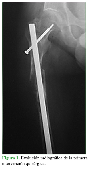La evolución posoperatoria a corto plazo fue mala, con osteosíntesis fallida asociada a imágenes heterogéneas y líticas difusas a nivel diafisario (Figura 1).