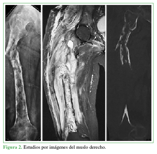 Los exámenes complementarios son múltiples, pero a nivel óseo, hemos utilizado las imágenes radiográficas, tomográficas y de resonancia magnética, para evaluar el compromiso óseo y de partes blandas, considerando que, en nuestro paciente, se superpuso con una infección severa pandiafisaria. Agregamos una angiorresonancia, aunque no es un estudio de rutina, para determinar la situación de los grandes vasos del miembro afectado.