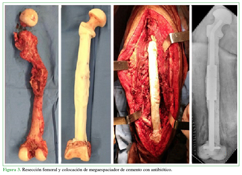 Resección femoral y colocación de megaespaciador de cemento con antibiótico.