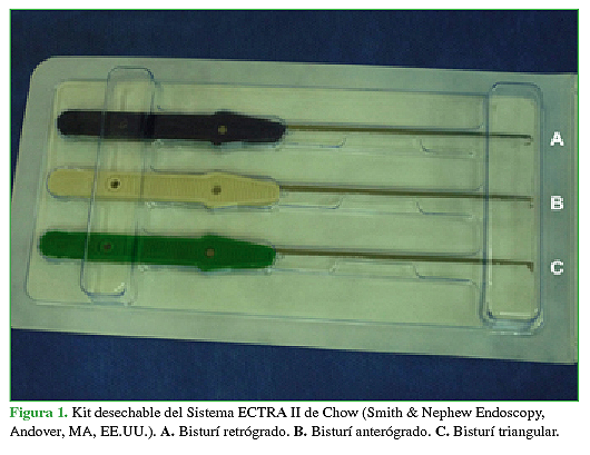 Figura 1. Kit desechable del Sistema ECTRA II de Chow (Smith & Nephew Endoscopy, Andover, MA, EE.UU.). A. Bisturí retrógrado. B. Bisturí anterógrado. C. Bisturí triangular.