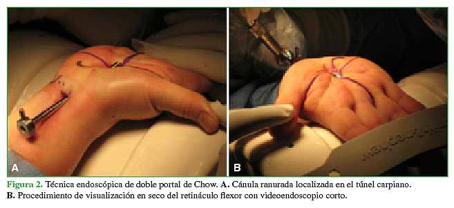 La técnica de doble portal de Chow para la sección endoscópica del RF es una opción fiable para el STC. Mediante la aplicación correcta del anestésico local, la localización precisa de los portales, la familiaridad con la anatomía endoscópica del carpo, la visualización clara de las estructuras del túnel carpiano y la destreza quirúrgica endoscópica es posible lograr resultados óptimos. La anestesia local permite que el paciente y el primer cirujano se puedan comunicar durante todo el procedimiento y así prevenir los potenciales riesgos intraoperatorios.17
