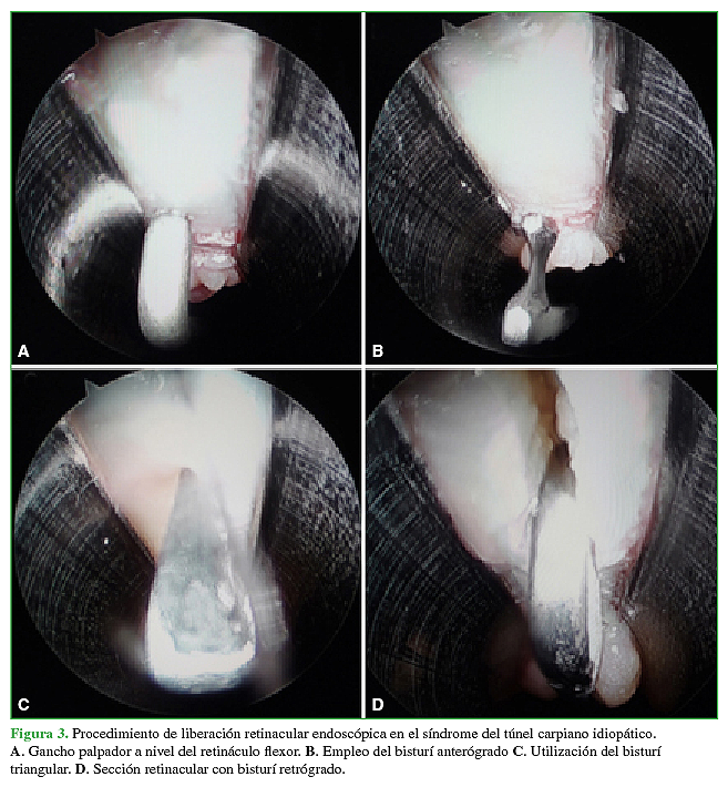 La cirugía se inicia con una incisión de 5 mm en el sitio del portal proximal, luego se identifica el borde proximal del RF, se introduce el disector romo curvo a nivel infrarretinacular del túnel carpiano hasta aflorar a nivel del portal distal, instalando la cánula ranurada y el videoendoscopio (Figura 2). Enseguida, es posible visualizar y palpar instrumentalmente el RF, se procede a su sección completa mediante el empleo consecutivo de los bisturíes anterógrado, triangular y retrógrado. Finalmente, se suturan los portales proximal y distal con un punto de piel (Figura 3).17