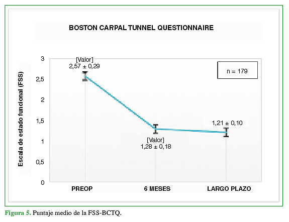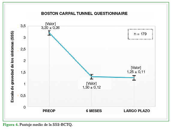 El tiempo medio de seguimiento fue de 97.9 meses (rango 42-162). Los pacientes refirieron síntomas de STC por un período promedio de 9.8 meses (rango 6-18). Para determinar los resultados, se los evaluó con las escalas del BCTQ, aplicando las subescalas SSS y FSS, antes de la cirugía, a los 6 meses y en el control final a largo plazo.