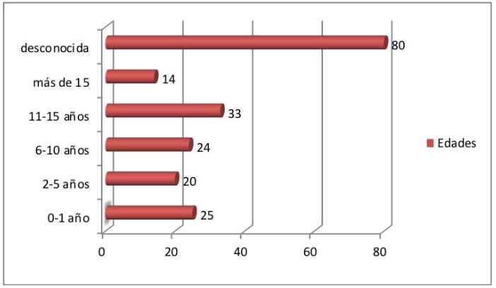 Fuente: Construcción propia con base en ANCR, Secretaría de Policía, Expedientes de juicios por tutoría de menores (1880-1930).El gráfico muestra que aunque existe una cifra alta de edad desconocida en los expedientes, se mantuvo un interés por denunciar el descuido de menores de edad entre los 0 y 15 años, es decir, de quienes estaban en edad escolar. Obviamente, aunque se desconozca la edad de los otros 80 individuos, estos habrían sido menores de edad, puesto que se disputaba la tutela o patria potestad en todos los casos. Este desconocimiento de la edad se debe a que en algunos expedientes solo se menciona el sexo y la cantidad que se disputaba, pero no así sus edades.