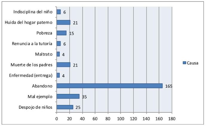 El abandono es la primera causa en los expedientes según la cantidad de casos —165—; recuérdese que cuando se habla de abandono se refería a que los padres y madres no eran capaces de darles alimento, vestido, educación ni tampoco satisfacía sus necesidades más básicas. La siguiente causa con mayor cantidad de casos es el despojo de niños; esta denuncia se hacía cuando una madre o un padre acusaba al otro de llevarse sus hijos de la casa o de impedirles que los visitara una vez que se cambiaban de vecindario, por ejemplo. La causa de huida se refiere a los casos en los que los padres acudían al juez a denunciar que su hija —la mayoría de casos— había huido con un hombre mayor, en esa oportunidad los padres reclamaban al juez la patria potestad y este hacía buscar a la joven para regresarla con sus padres.