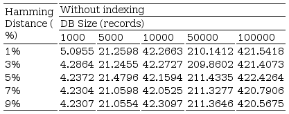 From the experimental results obtained, it appears that the proposed index requires less runtime in the identification process regardless of the percentage of Hamming distance used, compared to non-indexed query. The latter, for different Hamming distance values, the execution time is practically constant for the same database size. This is because this query scheme requires a sequential scan that simply calculates the scores for all objects in the database. Based on the results, it can be seen that the index implemented significantly improves the average time of execution of the consultation in the identification process with respect to the non-indexed query.