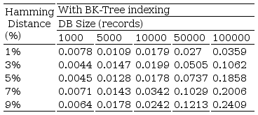 The experimental evaluation used a table containing the IrisCode (2048 bits) and an associated person identifier, generated from the CASIA-Iris-Thousand subset of the CASIA Iris Image Database V4.0 database [30]. The total execution time required by the query was compared using the implemented BK-Tree index on the one hand, and without index (exhaustive search in the database) on the other hand. Several database sizes and different percentages of Hamming distance were used for this comparison. The test was carried out on a laptop with an I5 350M processor and 4 GB memory, making five runs for each consultation scheme.