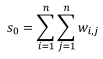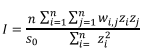 Donde zi es la desviación de un atributo con una característica i de su media (xi – X); wi,j es el peso espacial de las características i y j; n es igual al número total de las características, y s0 es el agregado de pesos espaciales.