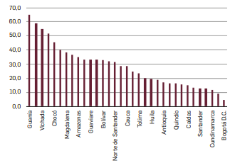 En la figura 4, a su turno, se muestra la incidencia de la pobreza multidimensional para los centros poblados y rural disperso de cada departamento de Colombia. Aquellos que presentaron mayores incidencias de la pobreza multidimensional en este dominio de estudio fueron Vaupés (78,8 %), Guainía (72,7 %), La Guajira (72,5 %), Vichada (67,3 %) y Chocó (59,6 %). Los departamentos que enfrentaron menor incidencia de la pobreza en sus centros poblados y rural disperso fueron Cundinamarca (19,8 %), Valle del Cauca (22,3 %), Quindío (25,7 %) y Boyacá (27,4 %). Bogotá D. C. presentó una incidencia de 19,2%.