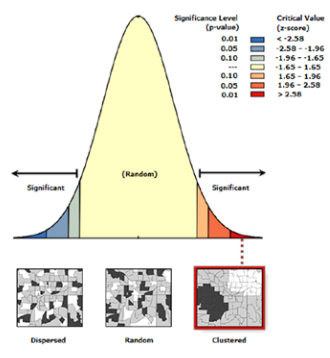 No obstante lo anterior, dado que tanto el valor P es estadísticamente significativo y la puntuación Z es positiva, se rechaza la hipótesis nula. “La distribución espacial de los valores altos y los valores bajos en el dataset está más agrupada espacialmente de lo que se esperaría si los procesos espaciales subyacentes fueran aleatorios” (ESRI, 2018). En cuanto a cada uno de los casos en el orden descrito, dado que el puntaje Z es de 5,164306, 6,834279 y 9,18735481166, existe una probabilidad de menos del 1 % de que este patrón agrupado pudiera ser el resultado de una probabilidad aleatoria.