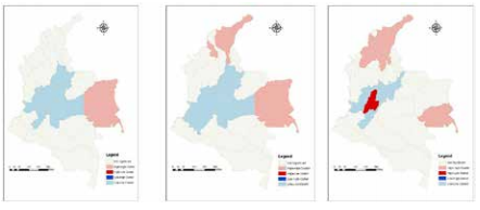 Al realizar el análisis de clúster y de valores atípicos se determinaron clústeres de pobreza. Se encontró con ello que, a nivel nacional, partes de las regiones Orinoquía y Amazonía, presentan un efecto vecindario, lo que implica que los departamentos con altos índices de pobreza se encuentran rodeados de departamentos en igualdad de condiciones. Al realizar dicho proceso a nivel cabecera se encontró que la región Caribe también ostenta ese fenómeno de contagio, y que este permanece y se torna mayor si se analiza a nivel de ruralidad y centros poblados. Cabe destacar que, para este nivel de desagregación, la región de la Orinoquia no presenta dicho comportamiento.