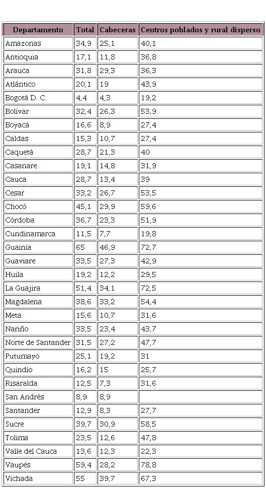 El Departamento Nacional de Estadística (DANE) identificó que, para el año 2018, la pobreza monetaria en Colombia aumentó en un 0,1 %; y la multidimensional, en 1,8 %. Es decir, en Colombia la pobreza monetaria refiere a 13.073.000 personas (27 % de la población del país), esto es, un aumento de 190.000 ciudadanos en comparación con el año 2016. Estos valores surgen al establecer el estándar de $ 257.433 por persona como línea de pobreza a nivel nacional. El DANE también estableció la desigualdad en el ingreso por hogares, conocido como Coeficiente Gini, en 0,517 en el año 2018, que corresponde a un incremento frente al 2016 (0,508) (DANE, 2019a; 2019b).