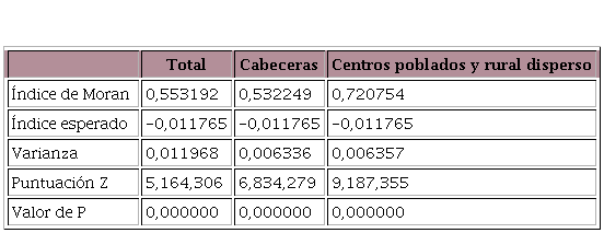 Se analizó en principio el índice de Moran para el indicador de la pobreza multidimensional respecto del valor departamental, y de las cabeceras, y para centros poblados y rural disperso; dentro de él,