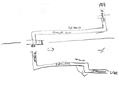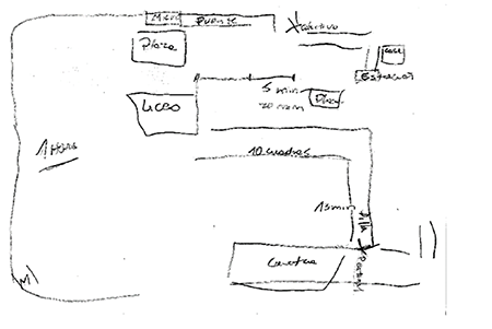 En el dibujo de Cristóbal, a diferencia de los mapas anteriores, los nombres y la ubicación de las calles, junto con los minutos destinados a caminar quedan altamente resaltados. Para él, la desconexión se torna determinante al momento de decidir salir de casa, al respecto manifiesta: