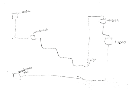 Camila tarda dos horas en conectar su casa con la universidad y viceversa. El viaje de ella involucra diversos medios de transporte, entre los cuales el ferrocarril y el microbús urbano son los más utilizados. El mapa de Camila divide la ruta casa-Estación de Temuco de la otra ruta que la llevará a la universidad. Esta última es representada por una línea horizontal en la parte inferior del dibujo. Para Camila el viaje resulta tedioso, no obstante, manifiesta: