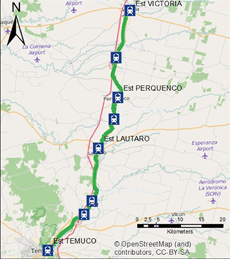 Respecto a Lautaro, ubicada en la Provincia de Cautín, cabe señalar que es una ciudad que está a treinta kilómetros de Temuco, y tiene una población estimada en 32.218 habitantes (Censo, 2002). Mientras que Perquenco está a poco más de veintidós kilómetros de Victoria, y tiene una población de 6.450 habitantes (Censo, 2002). Ambas ciudades están en pleno desarrollo, y pueden ser consideradas ciudades dormitorio. La Figura 1 presenta la ruta del ferrocarril, considerando las ocho[5] paradas que realiza.