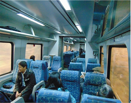 Respecto al servicio ferroviario, cabe mencionar que opera bajo la lógica de concesión, cuya responsabilidad de funcionamiento recae en Ferrocarriles del Sur Sociedad Anónima. El ferrocarril tiene capacidad para 132 personas que pueden viajar sentadas. El valor del pasaje, subsidiado por la ley espejo[6], llega a los $800[7] para el tramo Victoria-Temuco. La Figura 2 permite observar la infraestructura interna del ferrocarril.