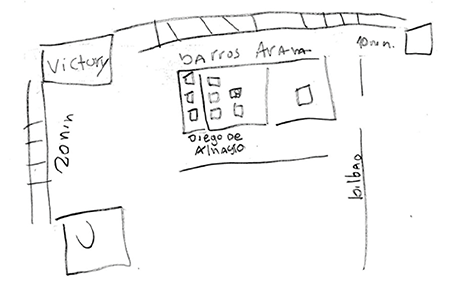 Cuando pienso qué tengo que dibujar, lo que hago es prestar atención a dos ciudades, escuático[13], porque me doy cuenta de que me muevo harto. Si me preguntai yo estoy caleta[14]de tiempo en Victoria, y ahí está la ruta, llego a Victory y camino hasta la U. Ahí paso todo el día hasta que camino de vuelta a la estación y ¡fuuuumm!, de vuelta a Temuco ¿qué me decís tú, igual piola o no?.