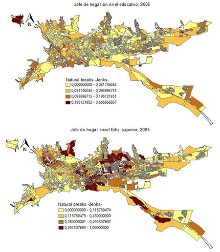A partir del proceso de expansión urbana, los nuevos desarrollos inmobiliarios y su localización por tipo de vivienda (VIS y NO VIS), evidencia una distribución socioespacial de los grupos poblacionales, distribución que está relacionada con la condición social de las personas que la habitan. Tal como indican algunos autores (Vivas, 2012) el nivel educativo del jefe del hogar es un determinante de segmentación fuerte, lo que significa que el capital humano que presenten los grupos poblacionales así mismo se ubicarán espacialmente, lo que tenderá a segregarlos. Para el caso de Ibagué se evidencia que en donde se encuentran ubicados los jefes de hogar con nivel educativo superior completo, la presencia de jefes de hogar sin nivel educativo son menores (Figura 6), de lo que se puede deducir que esta relación inversa muestra que el nivel educativo es un determinante de la posición socioespacial de este grupo poblacional en la ciudad.