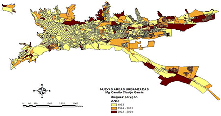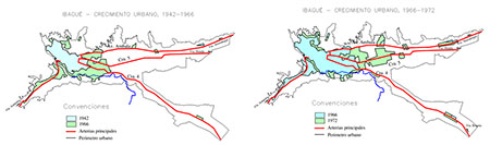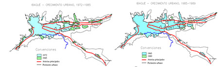 Finalizando esta fase se consolida la industrialización tomando importancia en la forma urbana de la ciudad, en especial por la exención de impuestos a los empresarios para activar la economía de la ciudad como consecuencia de la avalancha de Armero que generó desplazamientos de damnificados hacia ella (Espinosa, 1992; González, 2006). Las soluciones habitacionales de estos se dieron en la zona nor-oriental de Ibagué, manteniendo la tendencia de la expansión urbana desde 1985 hasta la década de 1990 (Espinosa, 1992) (Figura 2); además, paralelamente fueron surgiendo viviendas autoconstruidas alrededor del Río Chipalo, Salado, Ambalá y Picaleña, entre otros.