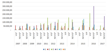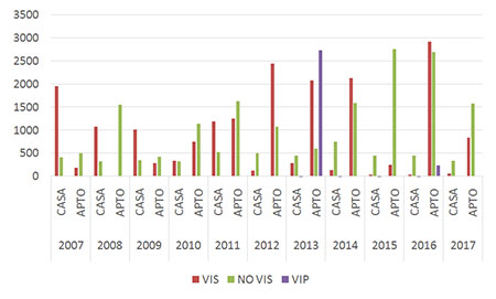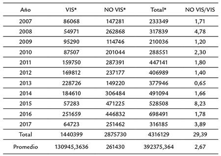 En contraste con el periodo entre 1997 y 2007, la dinámica del urbanismo para VIS en el periodo 2007 y 2017 no fue predominante como para el primero es decir, las licencias de construcción son sobresalientes para las NO VIS a excepción del año 2013, de lo que se concluye que por cada metro cuadrado que se aprobó para VIS se aprobaron 2,7 metros cuadrados para NO VIS (Tabla 2), situación que contrasta con el periodo comprendido entre 1997 y 2007 en el que la tendencia a la construcción de vivienda NO VIS fue predominante entre los años 1997 y 2002. Sin embargo lo que se aprobó por cada metro cuadrado para VIS fue de un poco más de 3 veces más para vivienda NO VIS (Clavijo, 2009).