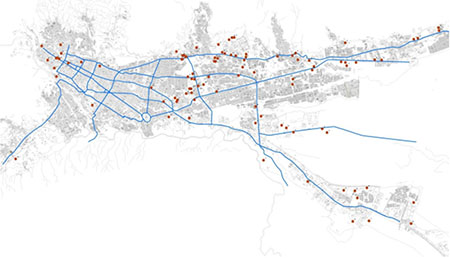 Luego, desde el año de 1964 hasta 1973, como parte de la fase de la inmigración permanente[5], la inmigración no se generó precisamente por la violencia sino por el estancamiento de la producción rural; aunado al fortaleciendo las vías, los servicios públicos y la infraestructura pública en general, situación que se dio de manera especial para la población de clase media–alta, generando así una valorización del suelo urbano de los lugares ocupados por ellos. En efecto, la inversión vial en este periodo (a diferencia de anteriores) y las vías importantes de la ciudad constituyeron una característica primordial para la expansión urbana que se dio luego (Figura 2).