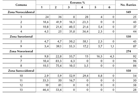 Las comunas que tuvieron nuevas áreas urbanizadas corresponden a las 5, 6, 7, 8 y 9, sin embargo las licencias de construcción otorgadas para el periodo entre 1997 y 2007 no se ubicaron de manera homogénea (Clavijo, 2009) en estas comunas ya que, hacia la comuna 7 se orientaron las soluciones para Vivienda de Interés Social (VIS) y hacia las comunas 5 y 6 se ubicaron las que no son viviendas de interés Social (NO VIS), cabe tener en cuenta que los estratos predominantes en estas comunas son el 1 y 2 para la primera y del 3 al 5 para las otras dos (Figura 4) (Tabla 1).