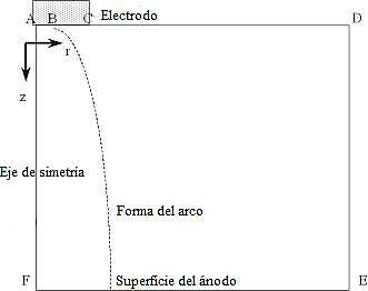 La figura 1 muestra un esquema del dominio computacional (cátodo-arco-ánodo). En cuanto a las condiciones de frontera, la lista completa requerida para todas las variables, también, se puede encontrar en el trabajo de Ramírez et al. [16]. Una parte importante del modelo matemático es la representación de las regiones cercanas a los electrodos (cátodo y ánodo). En esas posiciones se establece la salida de LTE y se necesita cuidado especial para representar el sistema. Para representar la región del cátodo, se supone que la caída de tensión en esa área puede estar relacionada con un término de flujo de calor denominado "caída catódica". En el ánodo, se consideran tres interacciones: flujo de calor del arco al ánodo, flujo de la densidad de corriente que entra en el ánodo y un esfuerzo de cizalla debido al chorro que impacta en el ánodo. En realidad, la presión debida a este choque del chorro de arco (que causa una deformación de la
