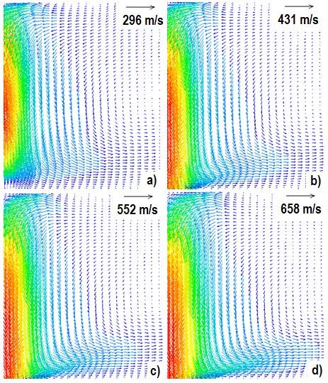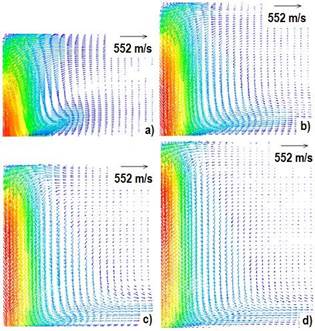En la figura 2 se presentan los patrones de flujo en 2D del chorro de plasma de CO2 con la misma longitud de arco de 5 mm y variando las corrientes del arco en a) 100 A, b) 150 A, c) 200 A y d) 250 A. Claramente se aprecia que el jet es más intenso (mayores velocidades) al aumentar la corriente del arco. La máxima velocidad del arco se duplica al aumentar la corriente de 100 a 250 A (ver tabla 1). Estos resultados son el producto de una mayor magnitud de las fuerzas de Lorentz que son proporcionales a la densidad de corriente. También se aprecia que el jet de 100 A no choca sobre el ánodo con fuerza a diferencia del de 250 A que llega mucha cantidad de movimiento. Estas consideraciones de la presión del arco se deben tomar en cuenta para correlacionar defectos de la soldadura.