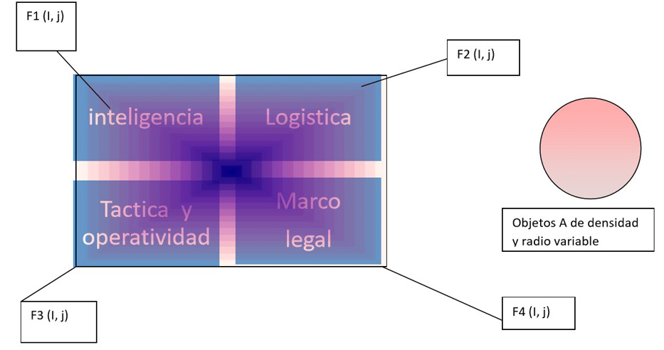 Donde las F(i,j) son fuerzas aleatorias provenientes de los cuadros del Estado analizados, estos crean un grupo de fuerzas aleatorias en la superficie de la plataforma; la coordinación se establece cuando el objeto A de densidad y radio variable se mantenga en una zona de tolerancia. El movimiento de la esfera define sobre la superficie un movimiento típicamente browniano3 donde los elementos sobre la superficie son las fuerzas aleatorias definidas en este recinto como consecuencia de las cuatro fuentes de fuerzas aleatorias a las cuales se incorporan las influencias posibles desde el exterior; la estabilidad dentro de la zona de tolerancia solo se alcanza cuando todos los elementos (cuadros) estén totalmente interconectados (grafo totalmente conexo) “se logra la verdadera coordinación”; en caso de no lograrse deben de ser reubicados los cuadros correspondientes y entrenarlos en la nueva concepción: “la coordinación”.