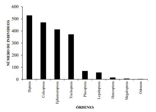 La caracterización de la comunidad de insectos acuáticos en la deriva, en el tramo estudiado del río Gatú, en términos de abundancia, se encuentra dominada por los órdenes: Diptera, Coleoptera, Ephemeroptera y Trichoptera, los cuales representaron el 92,2 %, mientras que los órdenes Plecoptera, Lepidoptera, Heteroptera, Megaloptera y Odonata representan el 7,8 % de la deriva total.