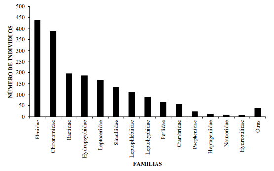 Las familias más abundantes de insectos en la deriva en el tramo del río Gatú, fueron: Elmidae (Coleoptera) con 439 (22,7 %) individuos, seguido de Chironomidae (Diptera) con 390 (20,2%); Baetidae (Ephemeroptera) con 196 (10,1%), Hydropsychidae (Trichoptera) con 187 (9,7 %), Philopotamidae (Trichoptera) con 154 (8,0 %), Simuliidae (Diptera) con 135 (7,0 %), Leptophlebiidae (Ephemeroptera) con 112 (5,8 %), Leptohyphidae (Ephemeroptera) con 91 (4,7 %), Perlidae (Plecoptera) con 69 (3,6%), Crambridae (Lepidoptera) con 57 (2,9 %), Psephenidae (Coleoptera) con 24 (1,2 %), Hydroptilidae (Trichoptera) con 17 (0,9%), Leptoceridae (Trichoptera) con 13 (0,7 %), Heptageniidae (Ephemeroptera) con 12 (0,6 %), Naucoridae (Heteroptera ) con 9 (0,5 %), lo que representan el 98,4 % de la fracción derivante (Figura 2, Cuadro 1).