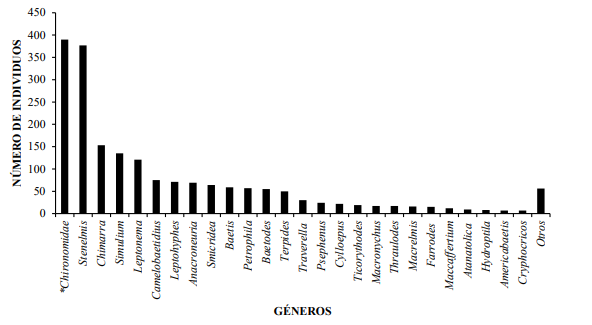 Los géneros más abundante en cuanto al número de individuos, presentes en la fracción de insectos en la deriva, en el tramo estudiado del río Gatú, fueron: Chironomidae (género sin determinar) con 390 (20,2%) individuos, seguido de Stenelmis con 377 (19,5 %), Chimarra con 153 (7,9 %), Simulium 135 (7,0 %), Leptonema con 121 (6,3%), Camelobaetidius con 75 (3,9 %), Leptohyphes con 71 (3,7%), Anacroneuria con 69 (3,6 %), Smicridea con 64 (3,3 %), Baetis con 59 (3,0 %), Petrophila con 57 (2,9 %), Baetodes con 55 (2,8 %), Terpides con 50 (2,6 %), Traverella con 30 (1,6 %), Psephenus con 24 (1,2 %), Cylloepus con 22 (1,1%), Ticorythodes con 19 (1,0 %), Macronychus con 17 (0,9 %), Thraulodes con 17 (0,9 %), Macrelmis con 16 (0,8 %), Farrodes con 15 (0,8 %), Maccaffertium con 12 (0,6 %), Atanatolica con 9 (0,5%), Hydroptila con 8 (0,4 %), Americabaetis con 7 (0,4 %), Cryphocricos con 7 (0,4 %), lo que representa el 97,1% de la fracción de insectos derivantes (Figura 3).