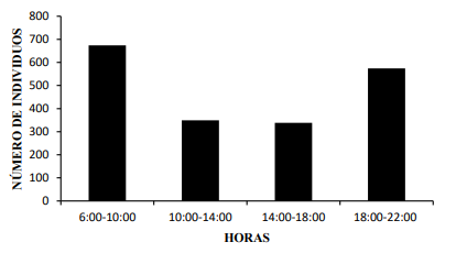 El calculó de la diversidad fue de H’=2,74 (J’=0,78, Taxa = 34) para el período de 6:00-10:00 h.; de H’=2,44 (J’=0,71, Taxa = 31) para el período de 10:00-14:00 h.; de H’=2,50 (J’=0,75, Taxa=28) para el período de 14:00-18:00 h.; y de H’= 2,67 (J’=0,75, Taxa = 35) para el periodo de 18:00-22:00 h. Se encontraron diferencias significativas en la diversidad entre los diferentes periodos de muestreo. Los períodos de 6:00 -10:00 h. (Diurno) y de 18:00-22:00 h. (Nocturno), mostraron la mayor diversidad (p˃0.05; t de Hutcheson).