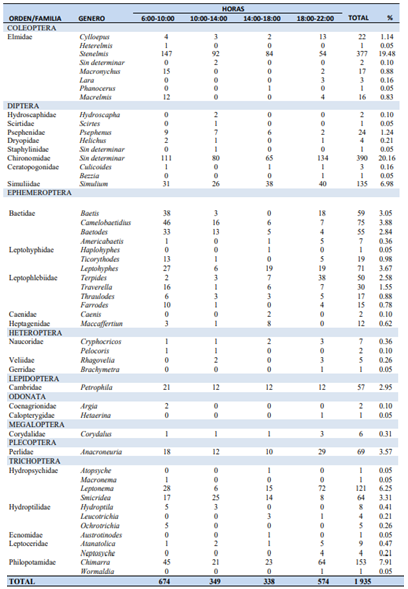 En el periodo de 6:00-10:00 h., se recolectaron 674 insectos acuáticos en la deriva distribuidos en 17 familias y 34 géneros, mientras que de 10:00-14:00 h., se obtuvieron 349 individuos con 19 familias y 31 géneros, de 14:00-18:00 h., 338 individuos, 17 familias, 28 géneros, y de 18:00-22:00 h. con 574 individuos distribuidos en 17 familias y 35 géneros. (Figura 4, Cuadro 1).