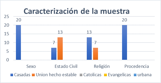 Según los datos obtenidos en la encuesta las edades oscilan entre los 20 a 30 años, la muestra está constituida solamente por mujeres con un 100%. Respecto a la religión, predomina la católica con un 65% seguida de la evangélica con 35%.
