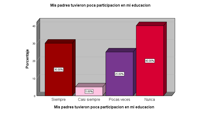 Los datos del grafico No. demuestran que el 40% de las mujeres expresaron que sus padres no participaron en su educación. En el cual se puede referenciar que la familia no tuvo el tiempo y lugar, durante la infancia, adolescencia y juventud de participar en la educación afectiva de las participantes. Siendo así, el otro 30% de las universitarias expresaron del papel que tomaron sus padres para poder brindarles educación en todos los aspectos.