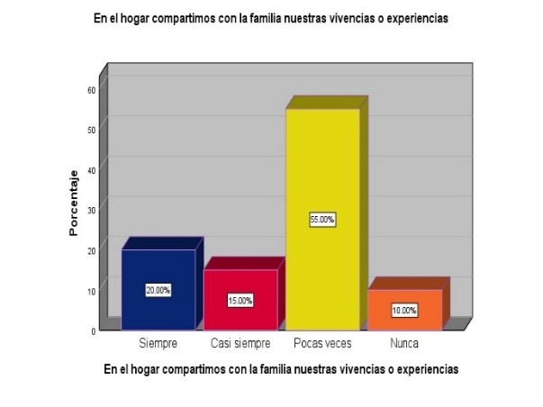 En el siguiente gráfico se aprecia que un 55% de las mujeres no han compartido mucho de sus vivencias y experiencias en el hogar, cabe mencionar que la afectividad, emociones, sentimientos y pasiones, desempeñan un papel importante en nuestras vidas. Están arraigadas biológicamente en nuestra naturaleza y forman parte de nosotros.