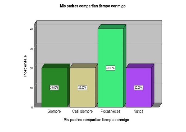 El otro 20% de las participantes expresan que sus padres si se relacionaban con ellas. Cabe destacar, que cuando sus padres compartieron poco tiempo con sus hijas, se sentían solas; todo esto sugiere vacíos de afecto que pueden, en muchos casos, llevarlos a llenar necesidades profundas como la seguridad, protección, etc. Mientras que si se comparte tiempo se fortalece el vínculo y se encuentran soluciones a diferentes problemáticas.